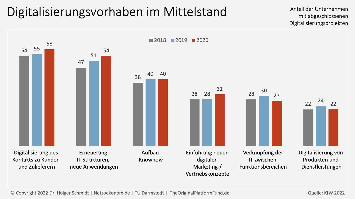 - 73 % glauben, dass durch langsame Digitalisierung Marktanteile verloren gingen; 78 % fürchten künftigen Abstieg ohne Digitalisierung.
